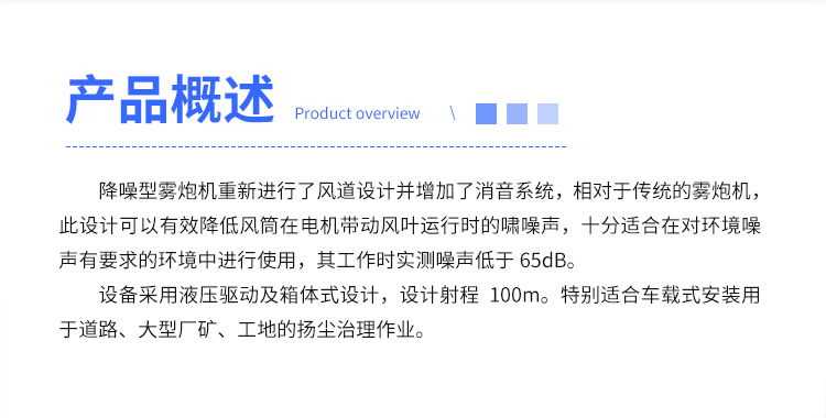 产品特点:80米降噪抑尘雾炮机增加了消音系统,相对于传统的雾炮机,此设计可以有效降低风筒在电机带动风叶运行时的啸噪声,十分适合在对环境噪声有要求的环境中进行使用,其工作时实测噪声低于65dB。