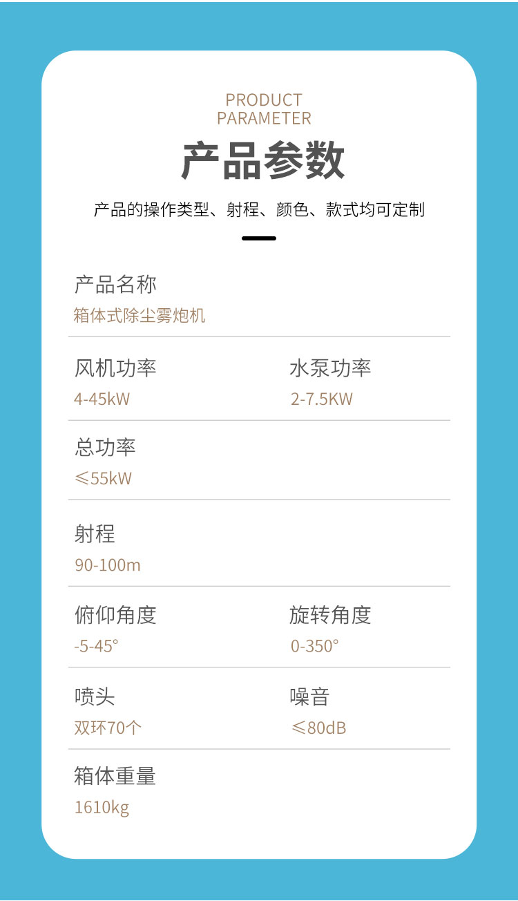 产品特点:100米车载式除尘雾炮机喷雾距离远、覆盖范围广、雾化颗粒细、降尘效果佳、运行平稳使用安全可靠。