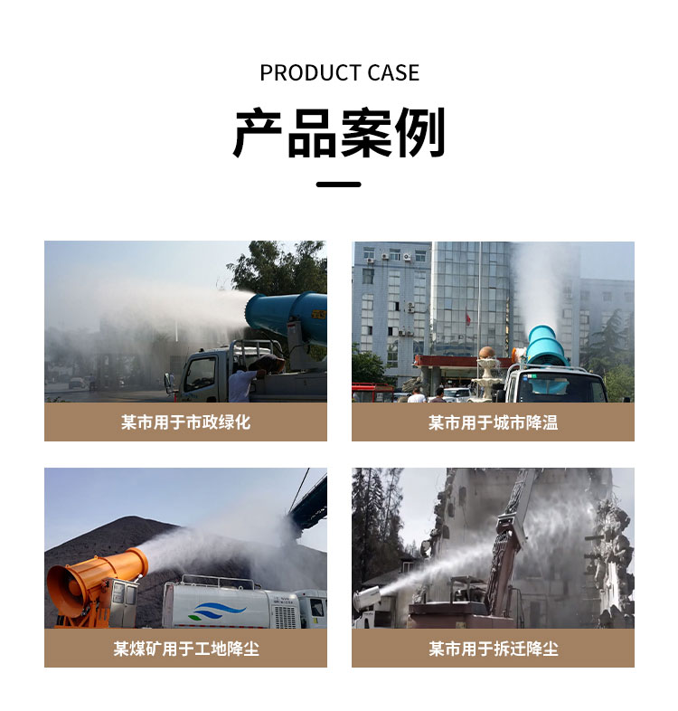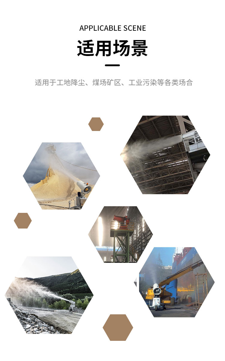 主要用途:用于煤矿场、城市拆迁工地、冶金钢铁企业、采矿区域、煤化工企业、水泥厂、火力发电厂、物料和矿产品露天堆放厂、混凝土处理厂、垃圾堆放场、垃圾焚烧厂、沙厂、干式物料仓库、露天爆破、重度粉尘区域。