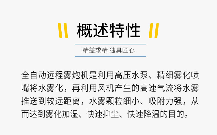 产品特点:50米全自动远程雾炮机快速降尘、射程远、覆盖范围广、可以实现精量喷雾;工作效率高、喷雾速度快;配套动力灵活,可定制化。