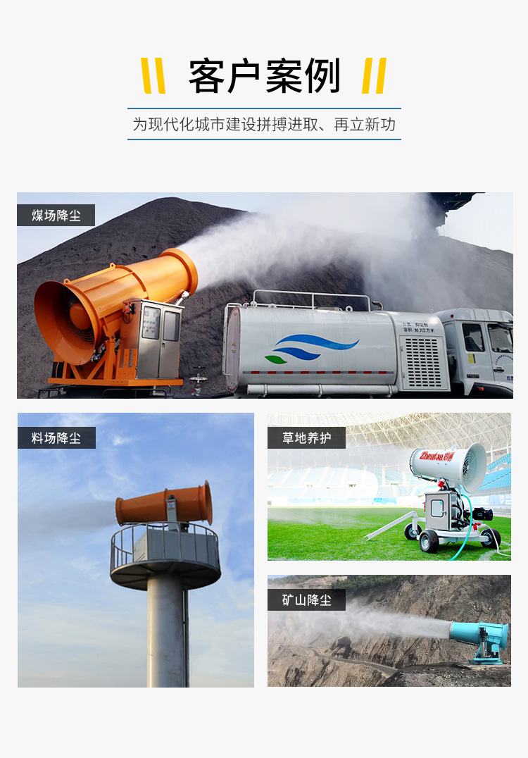主要用途:用于煤矿场、城市拆迁工地、冶金钢铁企业、采矿区域、煤化工企业、水泥厂、火力发电厂、物料和矿产品露天堆放厂、混凝土处理厂、垃圾堆放场、垃圾焚烧厂、沙厂、干式物料仓库、露天爆破、重度粉尘区域。