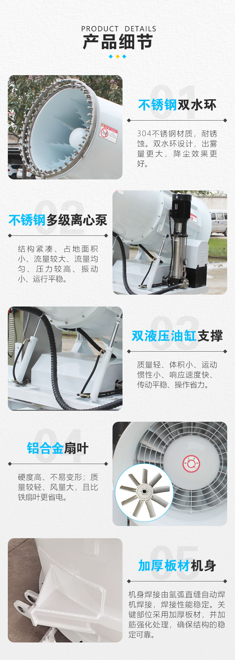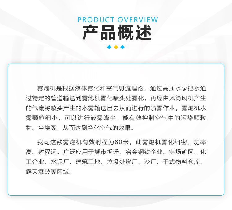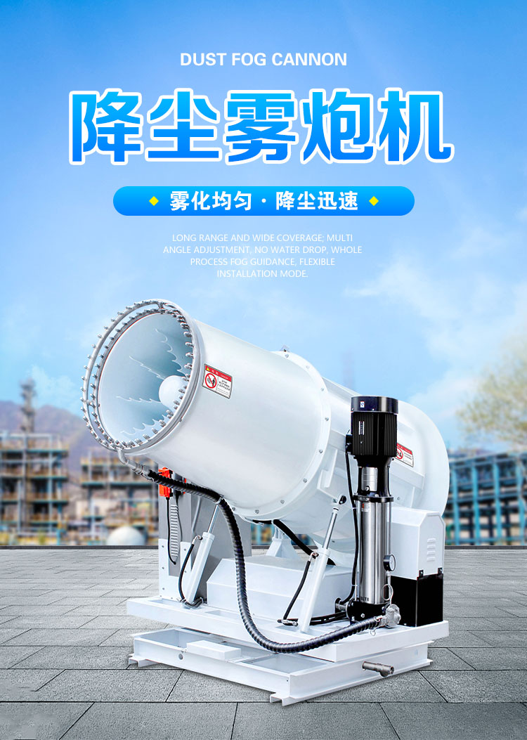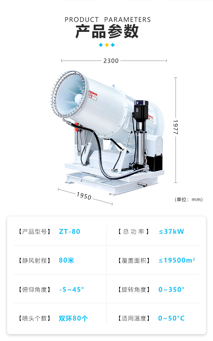 产品特点:80米降尘雾炮机射程远、覆盖范围广;多角度调节、无水珠全程雾引、安装方式灵活多变。