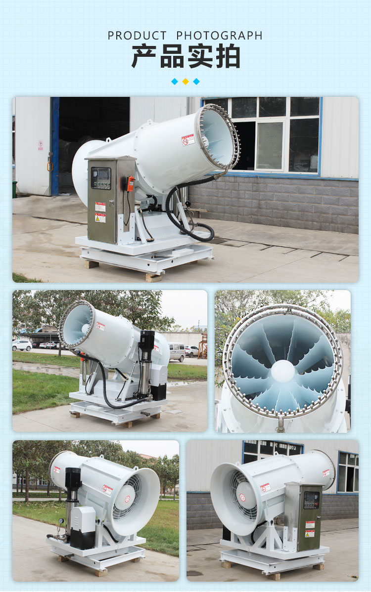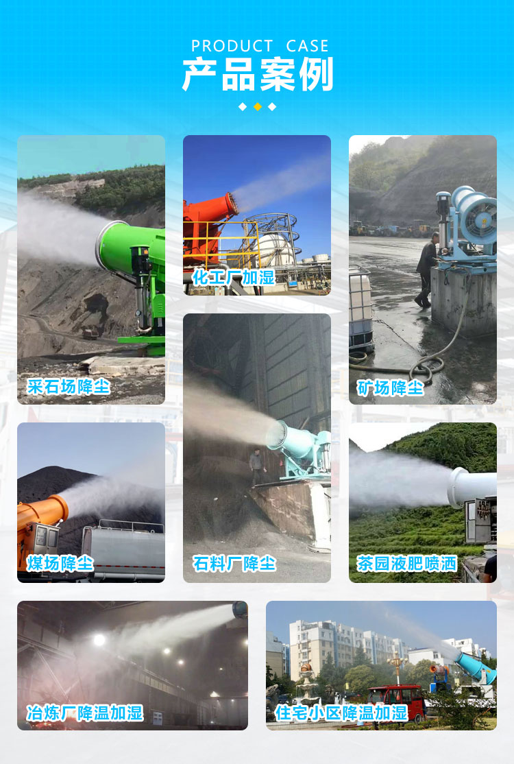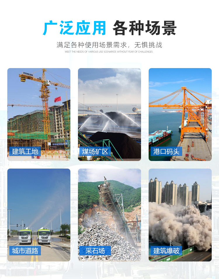 主要用途:用于煤矿场、城市拆迁工地、冶金钢铁企业、采矿区域、煤化工企业、水泥厂、火力发电厂、物料和矿产品露天堆放厂、混凝土处理厂、垃圾堆放场、垃圾焚烧厂、沙厂、干式物料仓库、露天爆破、重度粉尘区域。
