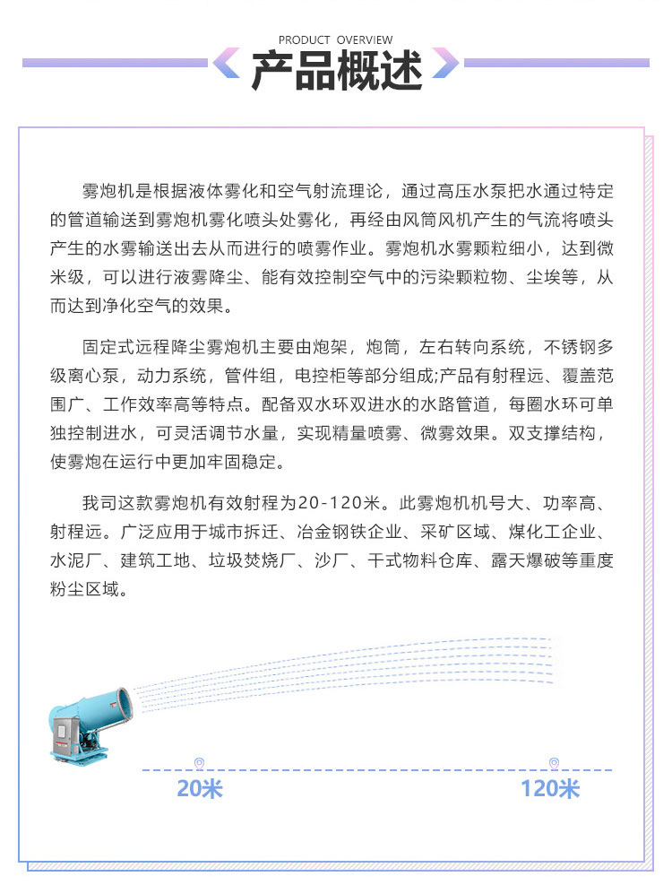 产品特点:120米固定式远程雾炮机射程远、覆盖范围广、工作效率高、可以实现精量喷雾;配套动力灵活、智能操控、防冻防堵。