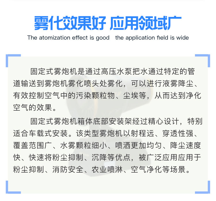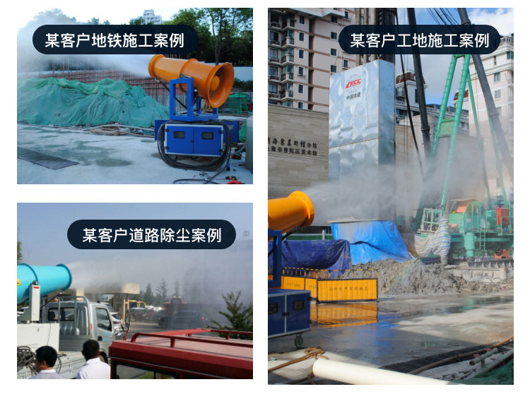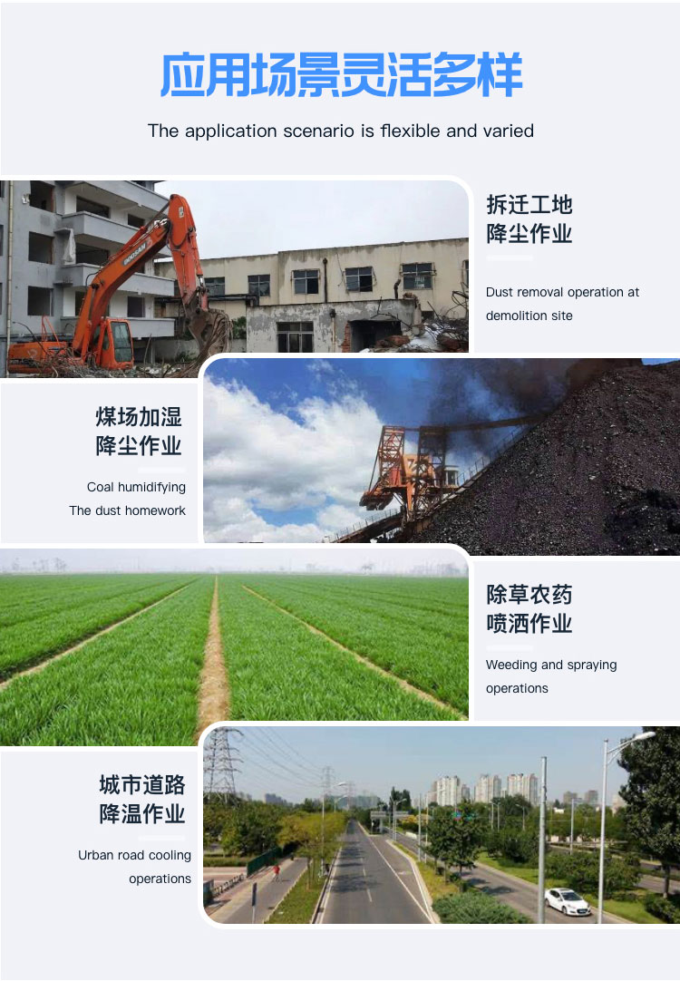 主要用途:用于煤矿场、城市拆迁工地、冶金钢铁企业、采矿区域、煤化工企业、水泥厂、火力发电厂、物料和矿产品露天堆放厂、混凝土处理厂、垃圾堆放场、垃圾焚烧厂、沙厂、干式物料仓库、露天爆破、重度粉尘区域。