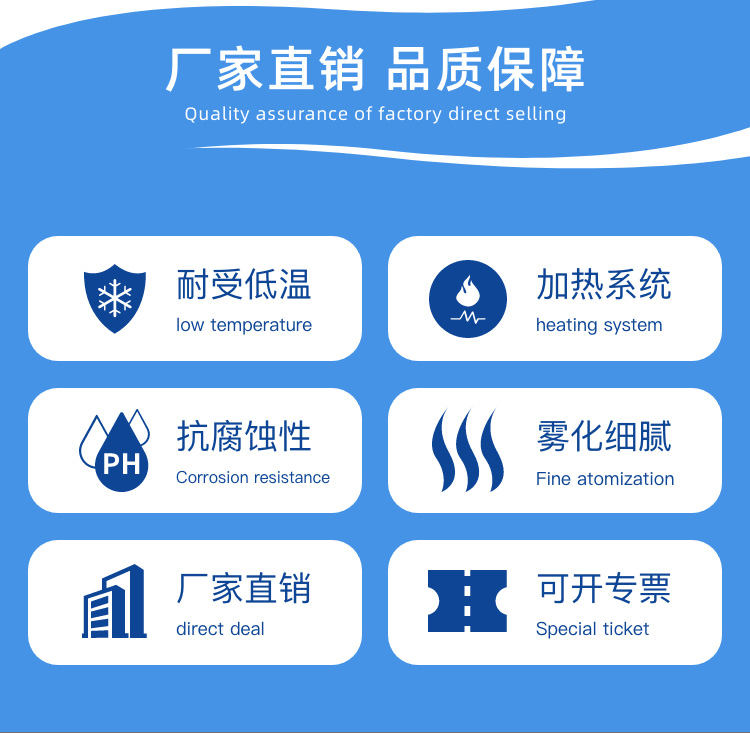 产品特点:化工厂不锈钢防腐射雾器使用不锈钢板材替换了普通碳钢板材。从而使得设备天然的具有耐锈,耐腐蚀能力;其它部件可喷涂环氧树脂防腐涂层进一步提升抗氧化能力。