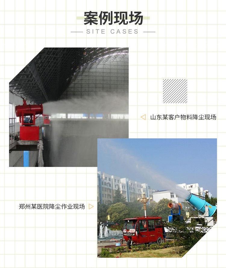 主要用途:适用于城市拆迁工地、冶金钢铁企业、采矿区域、煤化工企业、水泥厂、火力发电厂、建筑工地、物料和矿产品露天堆放厂、混凝土处理厂、垃圾堆放场、垃圾焚烧厂、沙厂、干式物料仓库、露天爆破、重度粉尘区域。