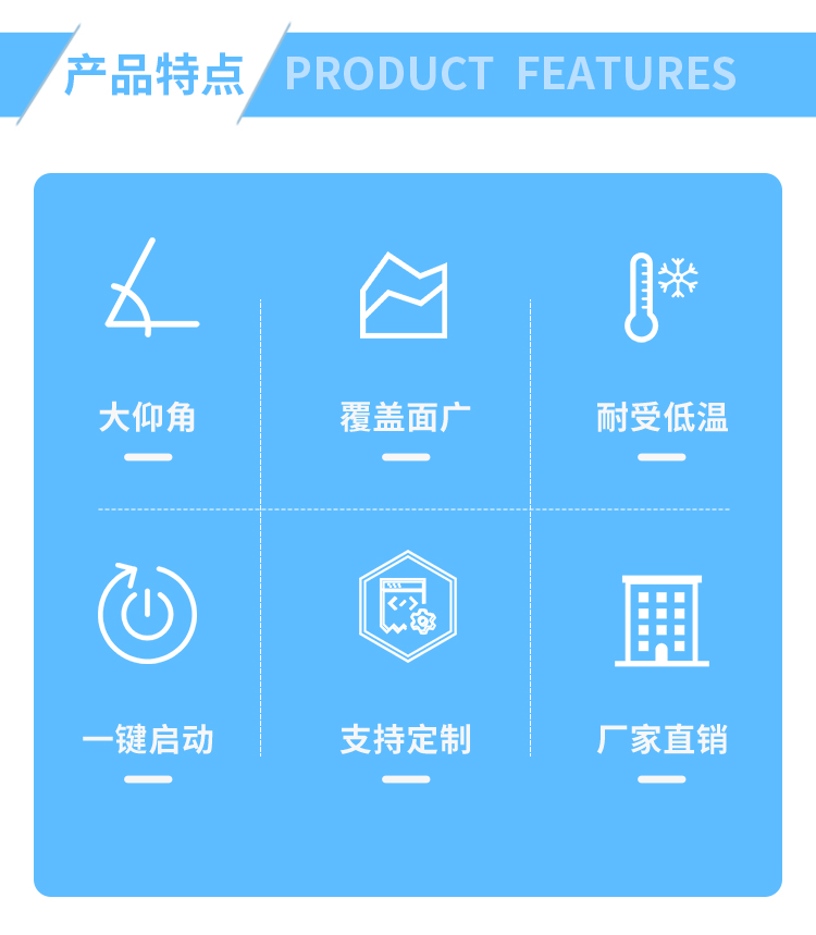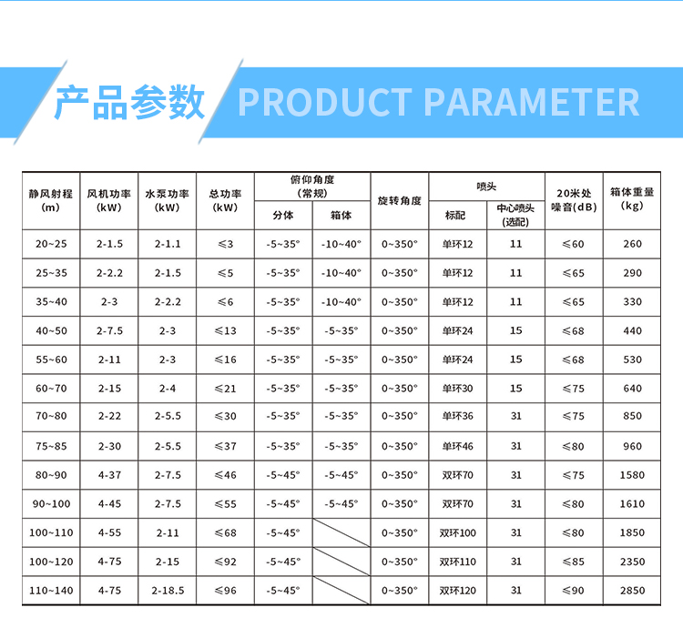 产品特点:塔式大仰角降尘雾炮有着让人惊叹的-45°-30°的上下移动区间,同时,针对塔台式安装方式而确定的更加牢固的底座+支撑结构的设计增强了设备的稳定性和可靠性。