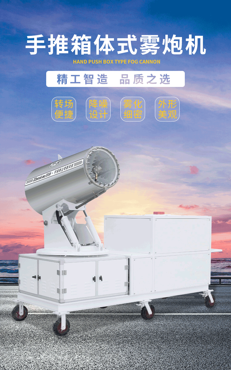 产品特点:手推箱体式雾炮机配备不锈钢中央喷头,水雾集中、雾化效果好;搭配1T容量的大型水箱,作业范围不再受水源条件困扰,喷雾时间更持久。
