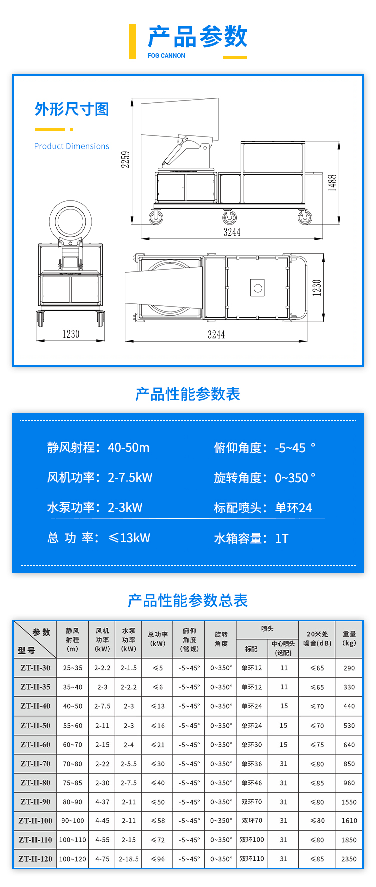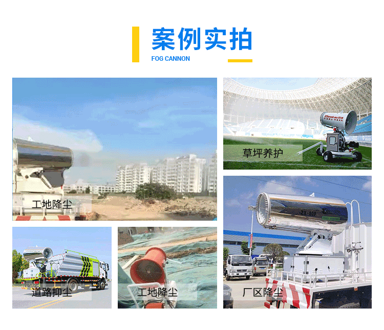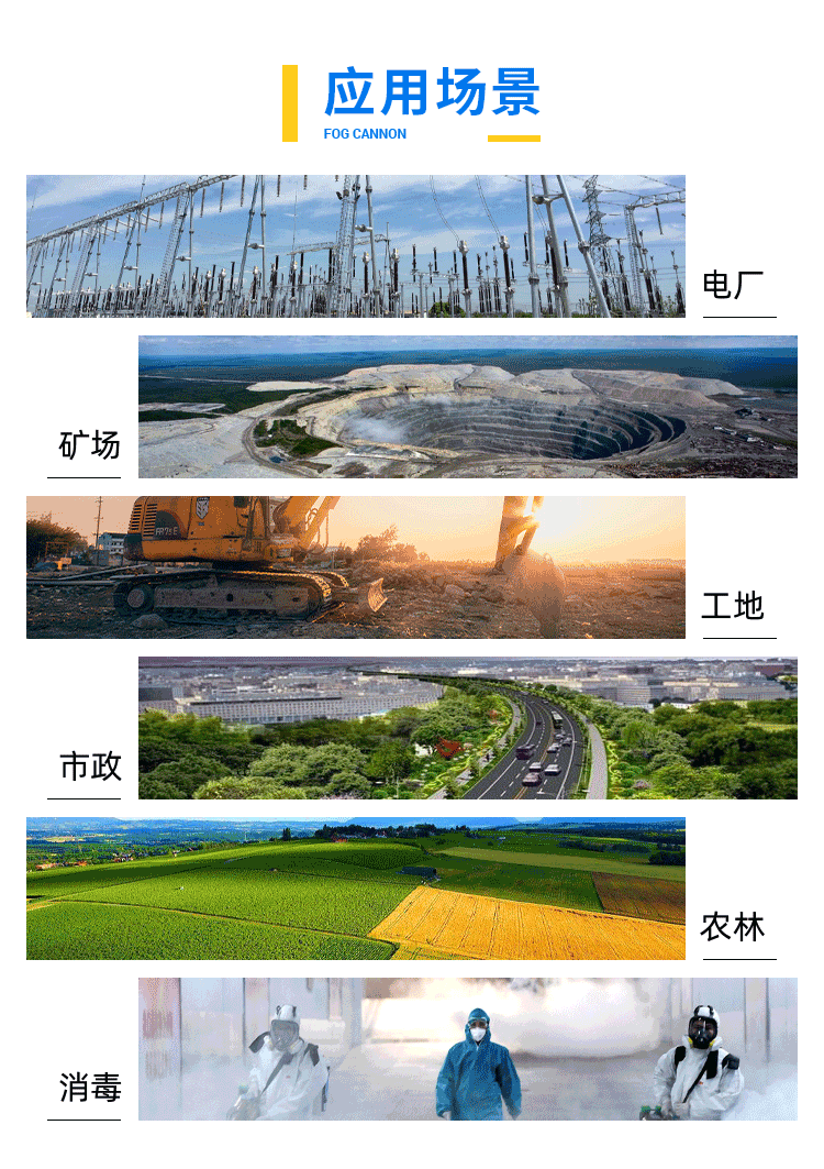 主要用途:建筑垃圾或废渣废料机械作业局部扬尘治理、重型车运输中道路扬尘污染治理;飞机场、高速公路、车站、码头、公共场所、运动场地、炎热场地等降尘保湿降温消毒。