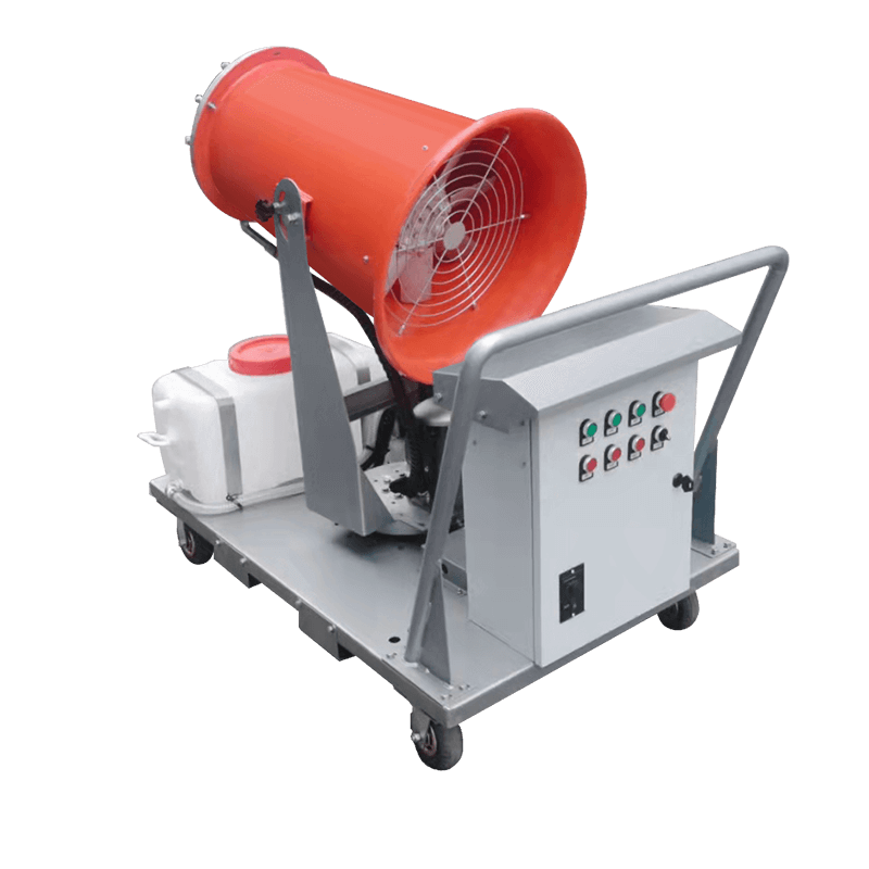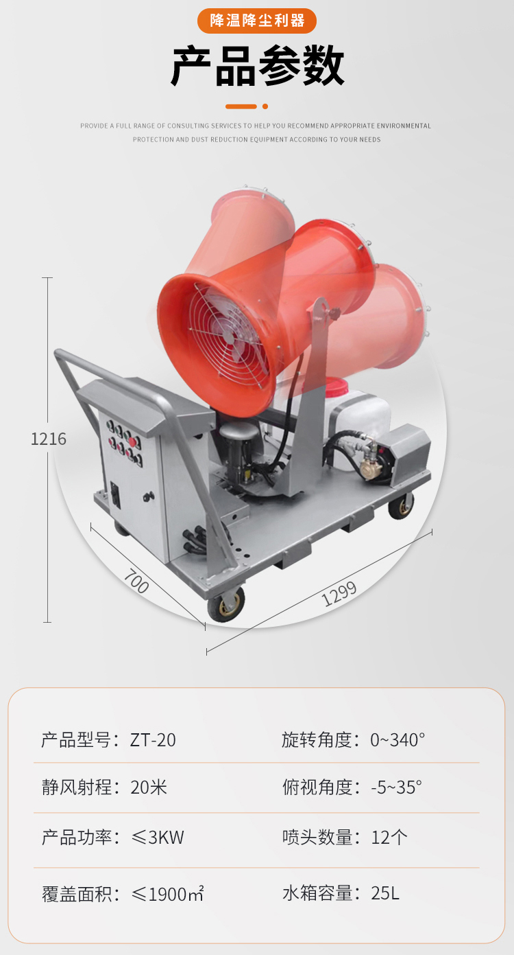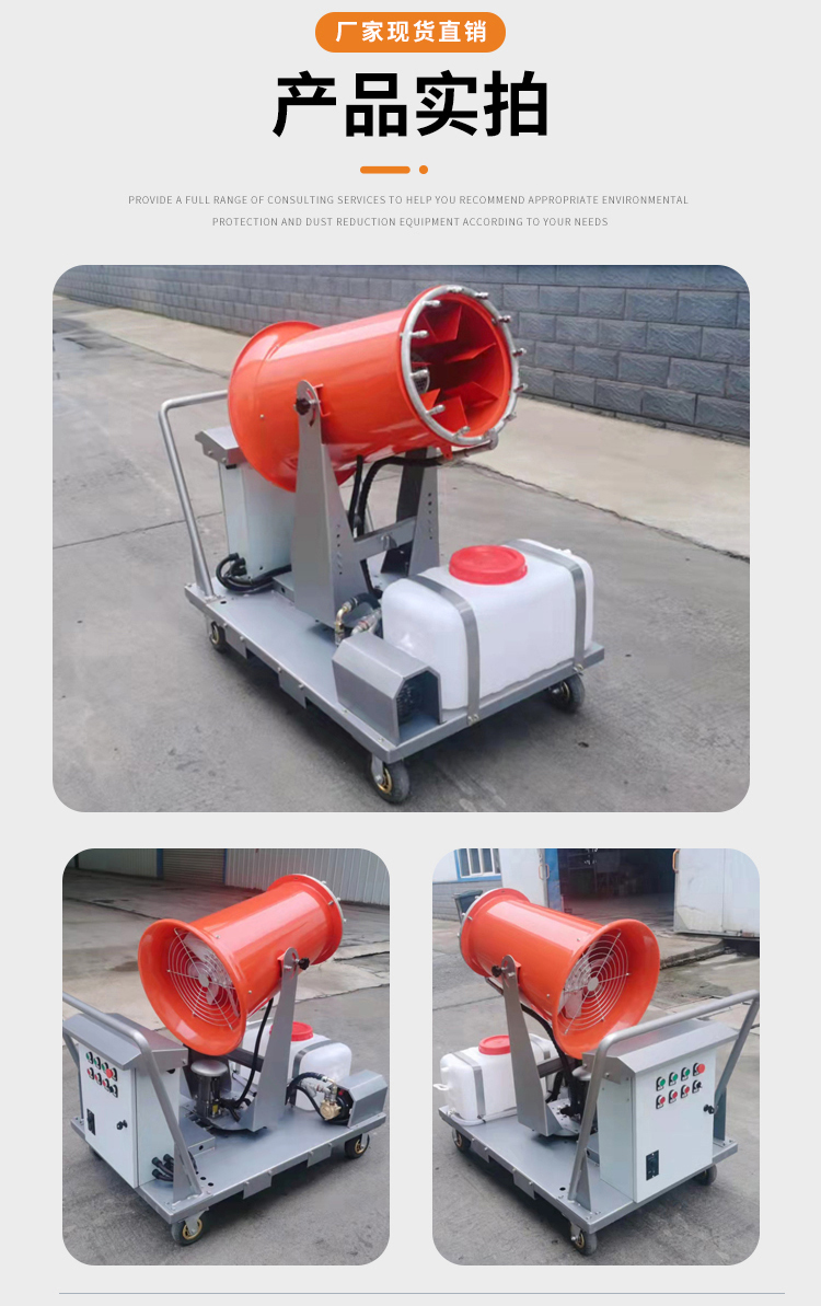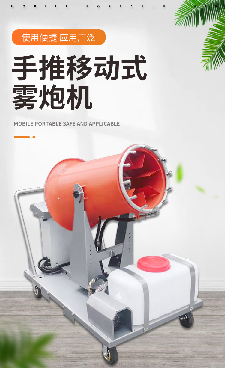 产品特点:手推移动式雾炮机降尘速度快、机结构紧凑、布局合理、移动灵活、构造简单易维护。