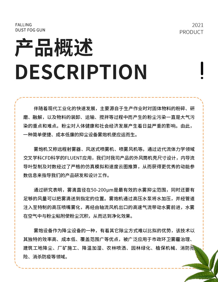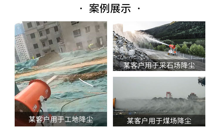 主要用途:用于煤矿场、城市拆迁工地、冶金钢铁企业、采矿区域、煤化工企业、水泥厂、火力发电厂、物料和矿产品露天堆放厂、混凝土处理厂、垃圾堆放场、垃圾焚烧厂、沙厂、干式物料仓库、露天爆破、重度粉尘区域。