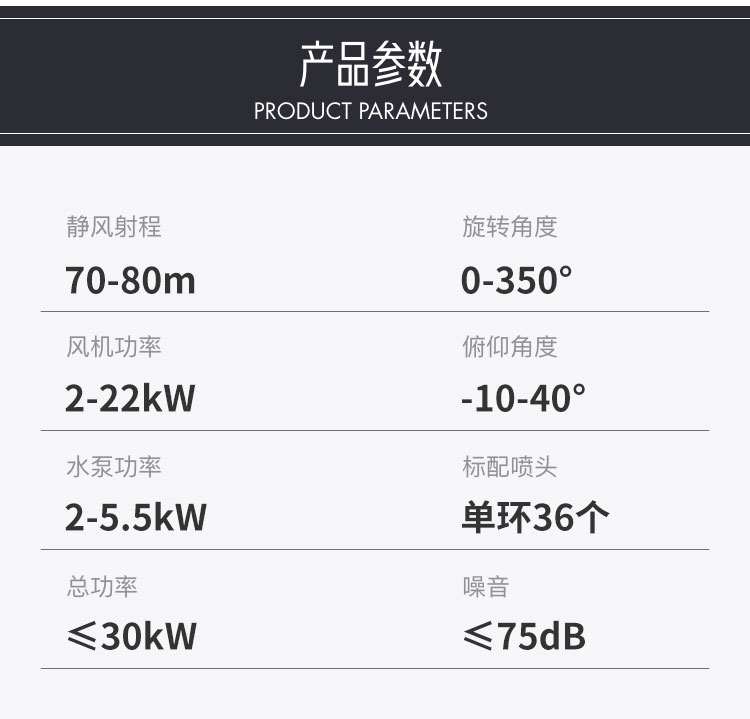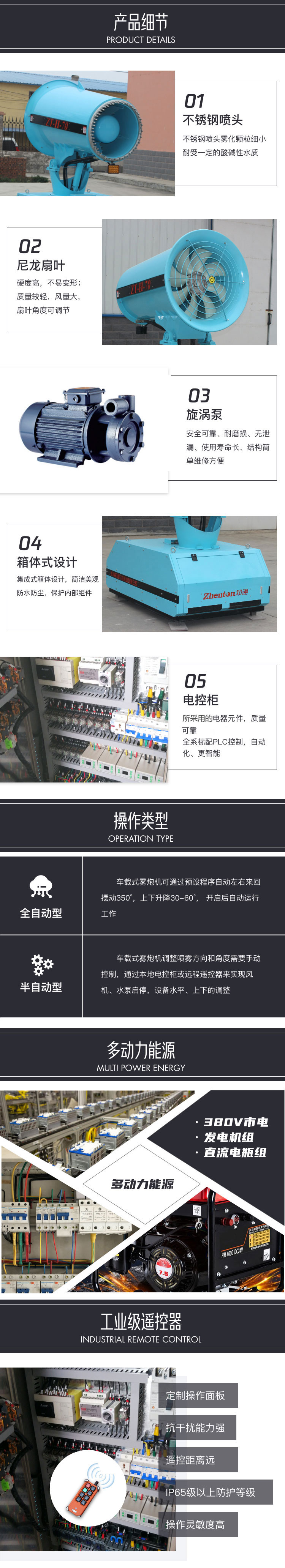 产品特点:车载式70米远程雾炮机一体化设计,射程远、覆盖面积大、雾化颗粒小,配套柴油发电机组安装在运输车辆上,操作灵活、安全可靠。