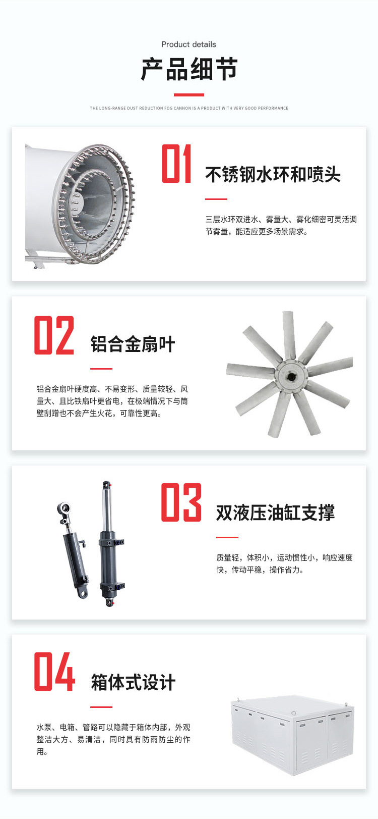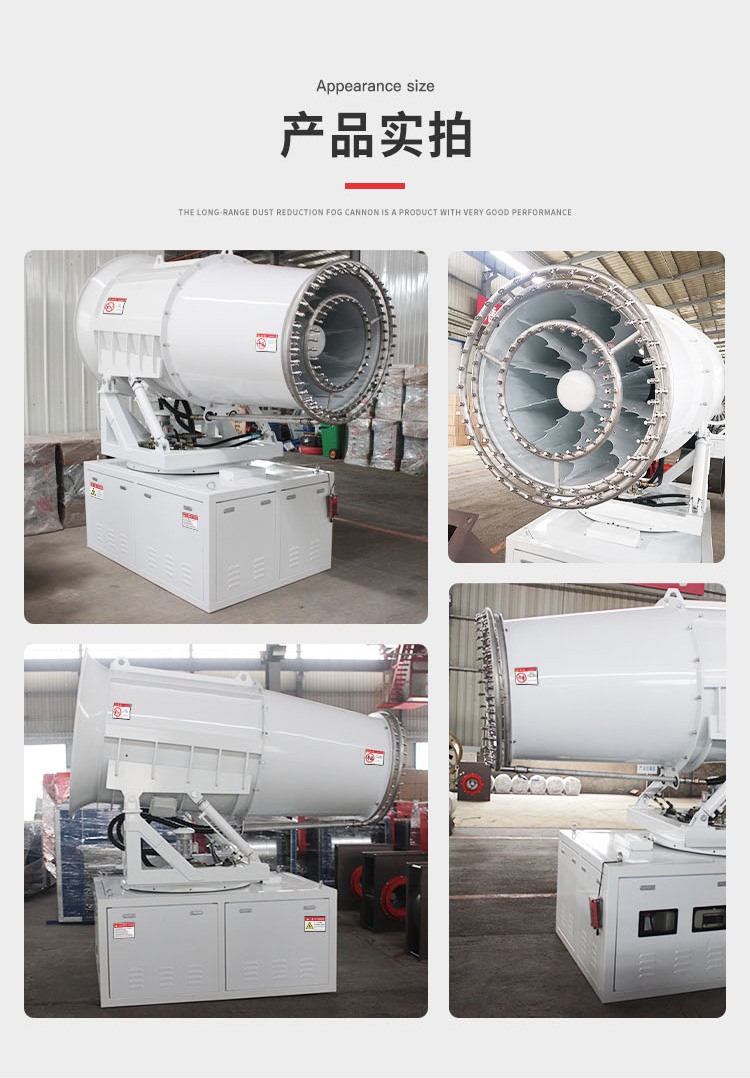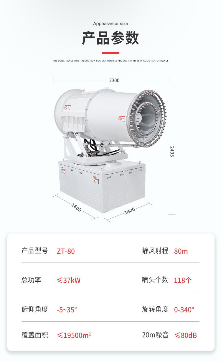 产品特点:80米远程降尘雾炮机雾化均匀、覆盖范围广、雾化颗粒细,智能操控模式、运行平稳使用安全可靠。