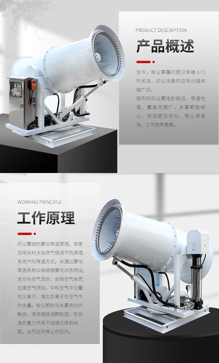 主要用途:用于城市拆迁工地、冶金钢铁企业、采矿区域、煤化工企业、水泥厂、火力发电厂、建筑工地、物料和矿产品露天堆放厂、混凝土处理厂、垃圾堆放场、垃圾焚烧厂、沙厂、干式物料仓库、露天爆破、重度粉尘区域。