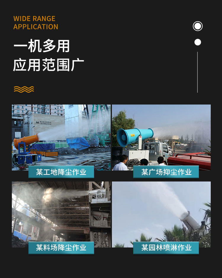 主要用途:用于城市拆迁工地、冶金钢铁企业、采矿区域、煤化工企业、水泥厂、火力发电厂、建筑工地、物料和矿产品露天堆放厂、混凝土处理厂、垃圾堆放场、垃圾焚烧厂、沙厂、干式物料仓库、露天爆破、重度粉尘区域。