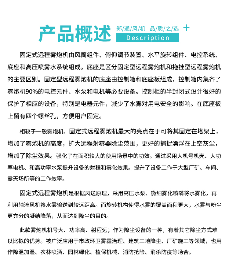 主要用途:用于煤矿场、城市拆迁工地、冶金钢铁企业、采矿区域、煤化工企业、水泥厂、火力发电厂、物料和矿产品露天堆放厂、混凝土处理厂、垃圾堆放场、垃圾焚烧厂、沙厂、干式物料仓库、露天爆破、重度粉尘区域。