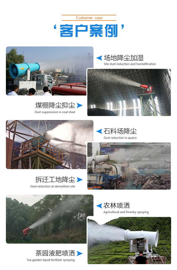 主要用途:用于煤矿场、城市拆迁工地、冶金钢铁企业、采矿区域、煤化工企业、水泥厂、火力发电厂、物料和矿产品露天堆放厂、混凝土处理厂、垃圾堆放场、垃圾焚烧厂、沙厂、干式物料仓库、露天爆破、重度粉尘区域。