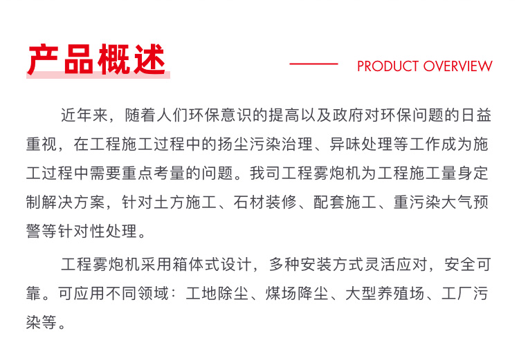 主要用途:适用于城市拆迁工地、冶金钢铁企业、采矿区域、煤化工企业、水泥厂、火力发电厂、建筑工地、物料和矿产品露天堆放厂、混凝土处理厂、垃圾堆放场、垃圾焚烧厂、沙厂、干式物料仓库、露天爆破、重度粉尘区域。