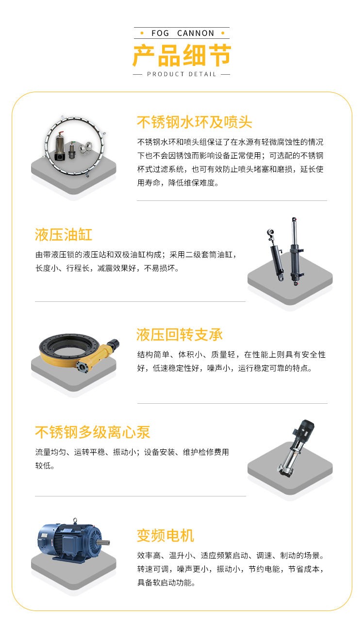 产品特点:多功能雾炮机射程远、覆盖范围广、工作效率高、可以实现精量喷雾;配套动力灵活,使用安全可靠。
