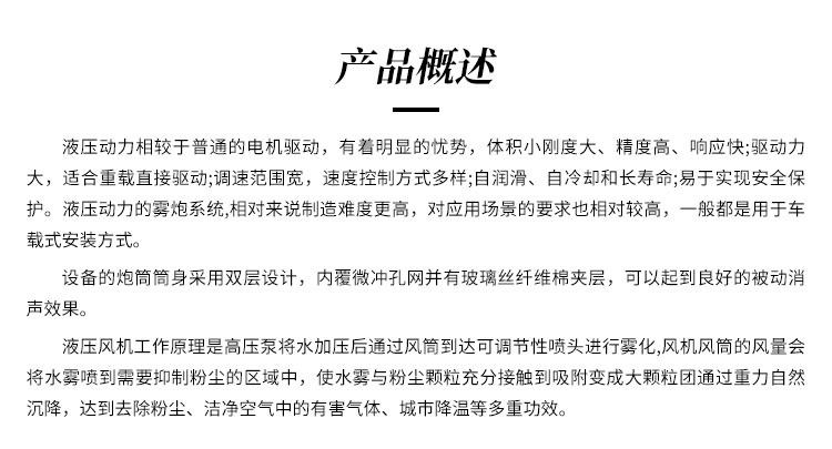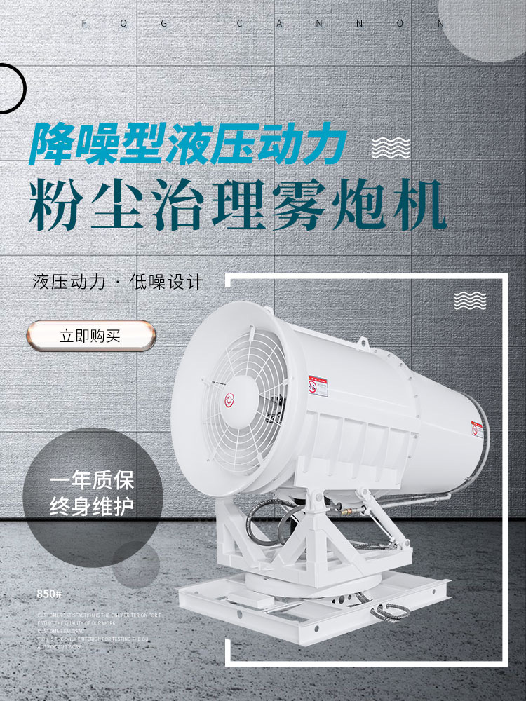 产品特点:80米液压雾炮机的炮筒筒身采用双层设计,内覆微冲孔网并有玻璃丝纤维棉夹层,可以起到良好的被动消声效果。