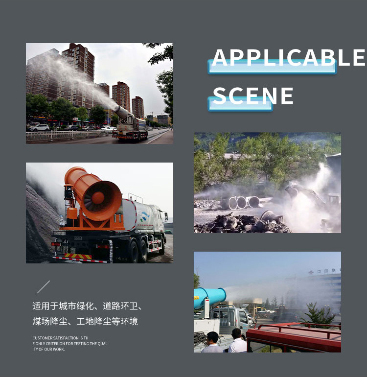 主要用途:用于城市拆迁工地、冶金钢铁企业、采矿区域、煤化工企业、水泥厂、火力发电厂、建筑工地、物料和矿产品露天堆放厂、混凝土处理厂、垃圾堆放场、垃圾焚烧厂、沙厂、干式物料仓库、露天爆破、重度粉尘区域。