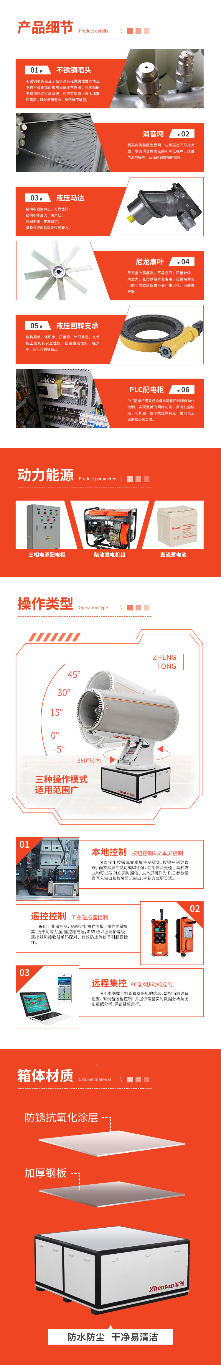 产品特点:降噪型液压雾炮机增加了消音系统,相对于传统的雾炮机,此设计可以有效降低风筒在电机带动风叶运行时的啸噪声,十分适合在对环境噪声有要求的环境中进行使用,其工作时实测噪声低于65dB。