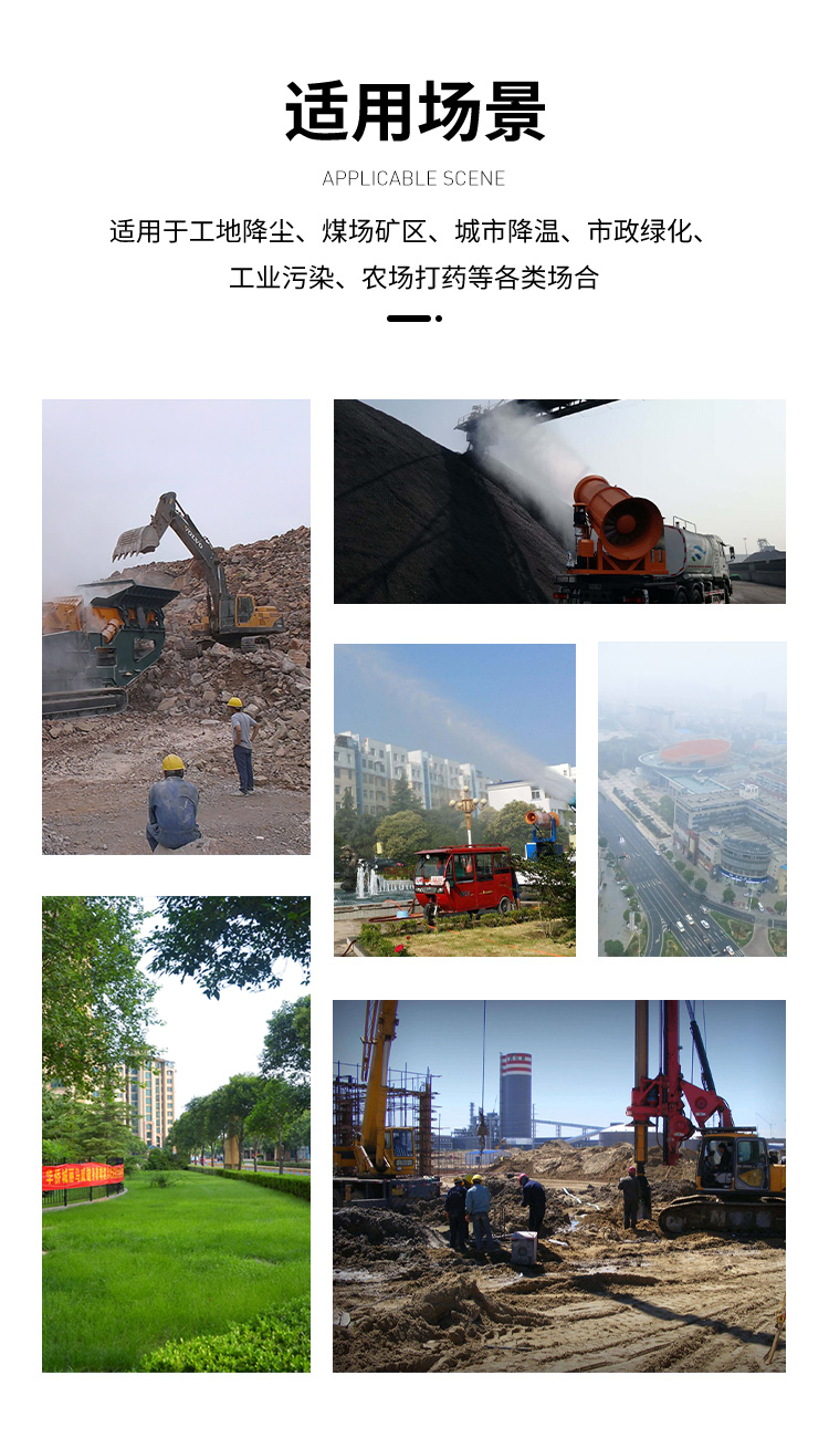 主要用途:用于煤矿场、城市拆迁工地、冶金钢铁企业、采矿区域、煤化工企业、水泥厂、火力发电厂、物料和矿产品露天堆放厂、混凝土处理厂、垃圾堆放场、垃圾焚烧厂、沙厂、干式物料仓库、露天爆破、重度粉尘区域。