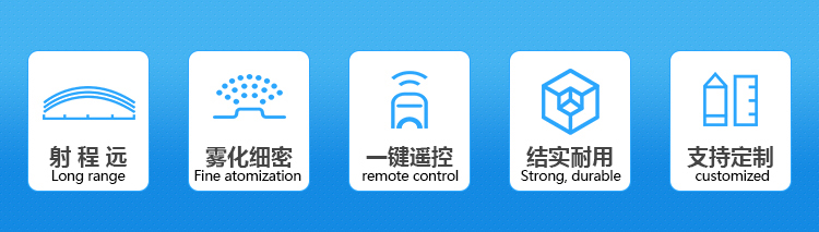 产品特点:车载式80米降尘雾炮机具有射程远、雾化细密等特点,采用工业级遥控器,可在100米外操作设备。