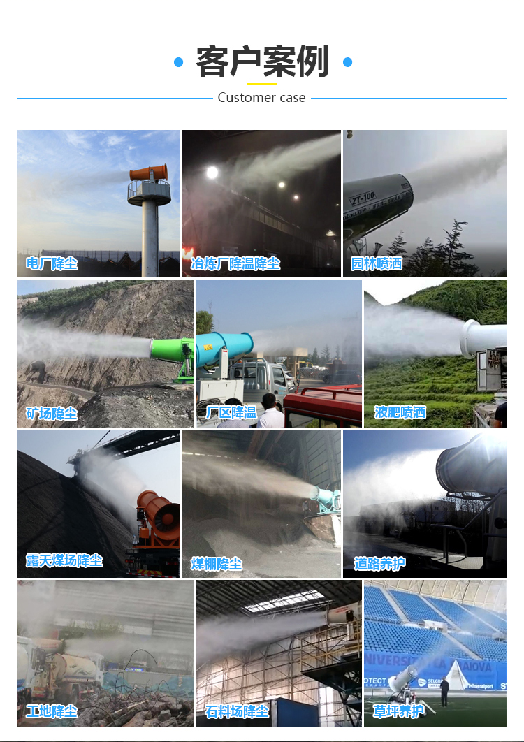 主要用途:用于城市拆迁工地、冶金钢铁企业、采矿区域、煤化工企业、水泥厂、火力发电厂、建筑工地、物料和矿产品露天堆放厂、混凝土处理厂、垃圾堆放场、垃圾焚烧厂、沙厂、干式物料仓库、露天爆破、重度粉尘区域。