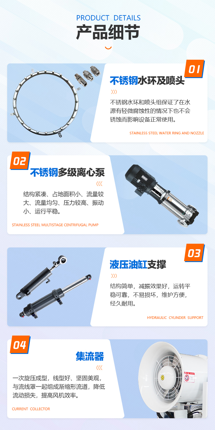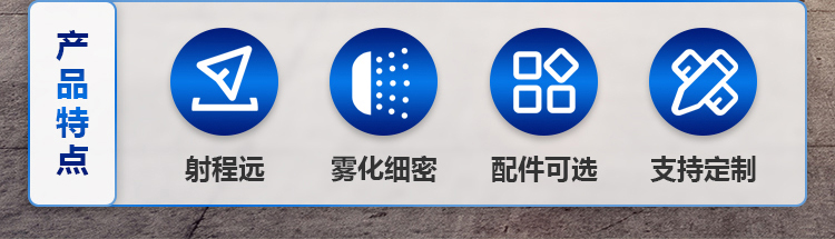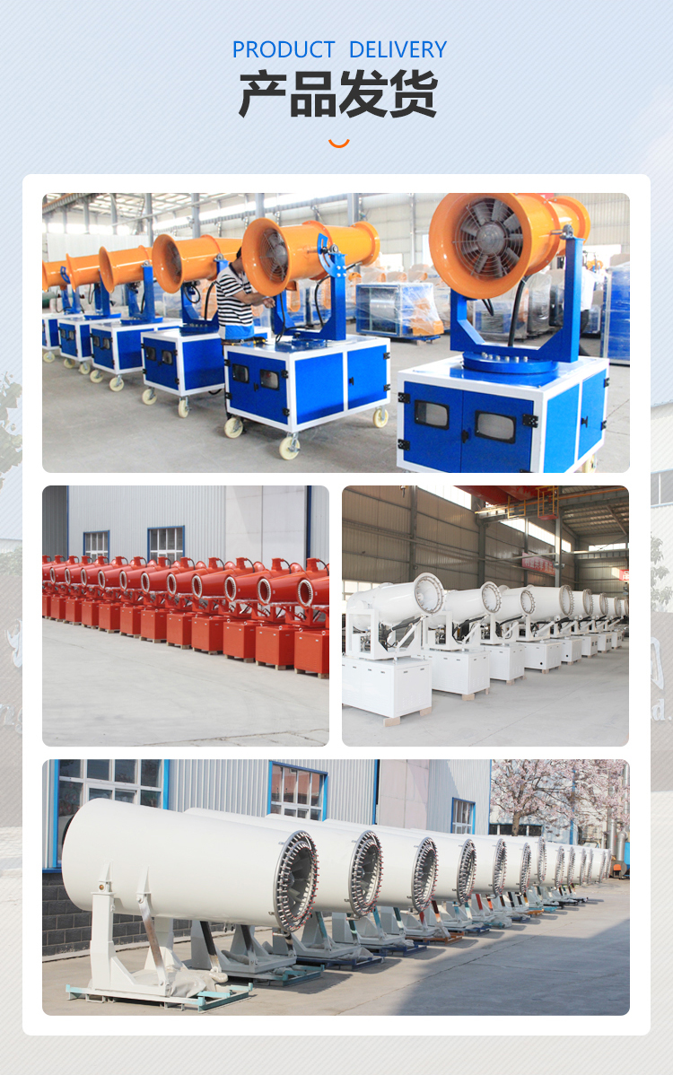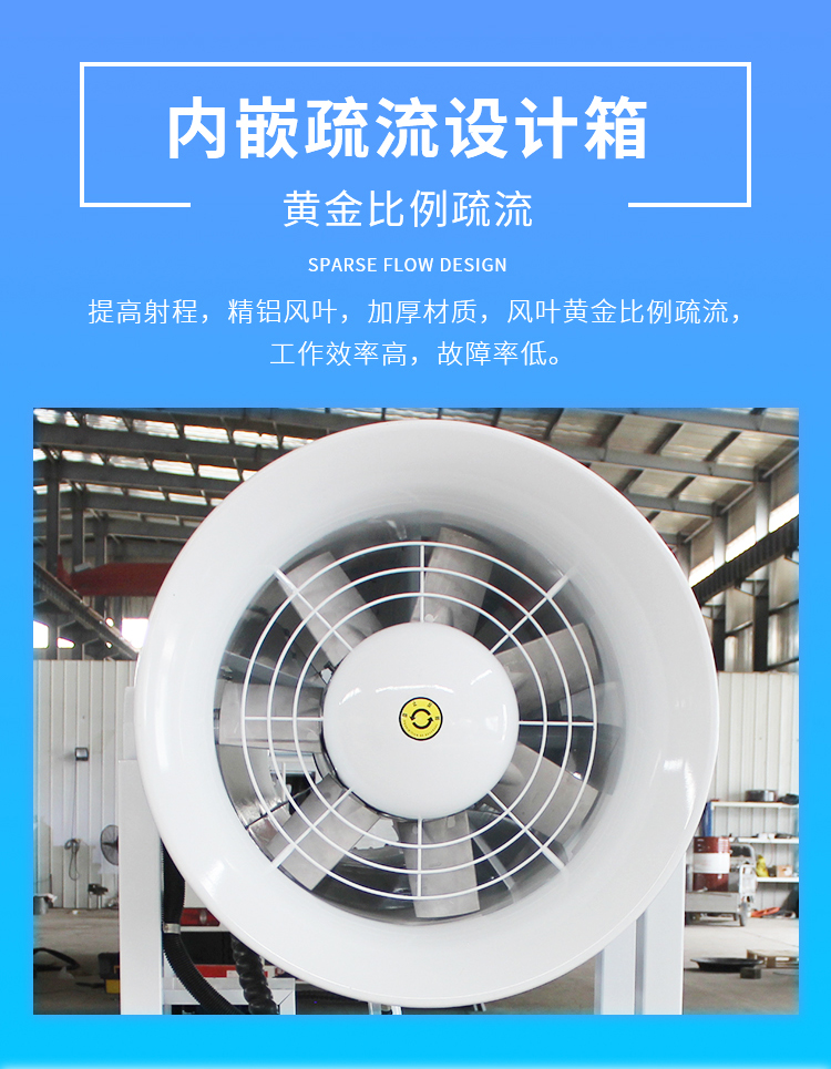 产品特点:化工厂降尘雾炮机采用内嵌疏流设计箱,可提高射程,精铝风叶,加厚材质,风叶黄金比例疏流,工作效率高,故障率低。