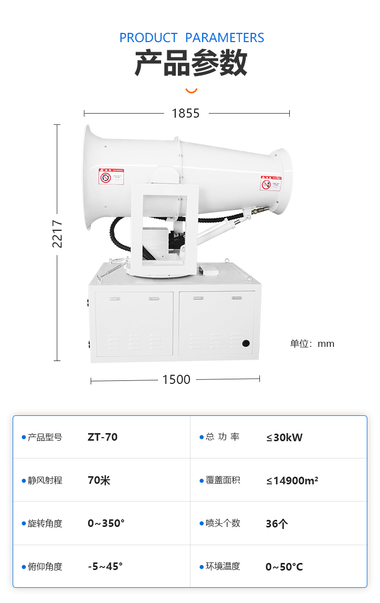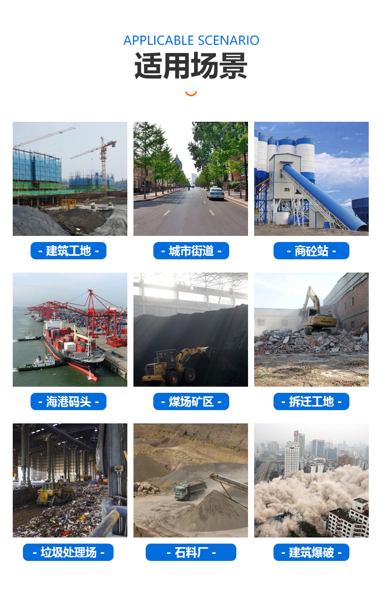 主要用途:用于煤矿场地、冶金钢铁企业、采矿区域、煤化工企业、水泥厂、火力发电厂、建筑工地、物料和矿产品露天堆放厂、混凝土处理厂、垃圾堆放场、垃圾焚烧厂、沙厂、干式物料仓库、露天爆破、重度粉尘区域。