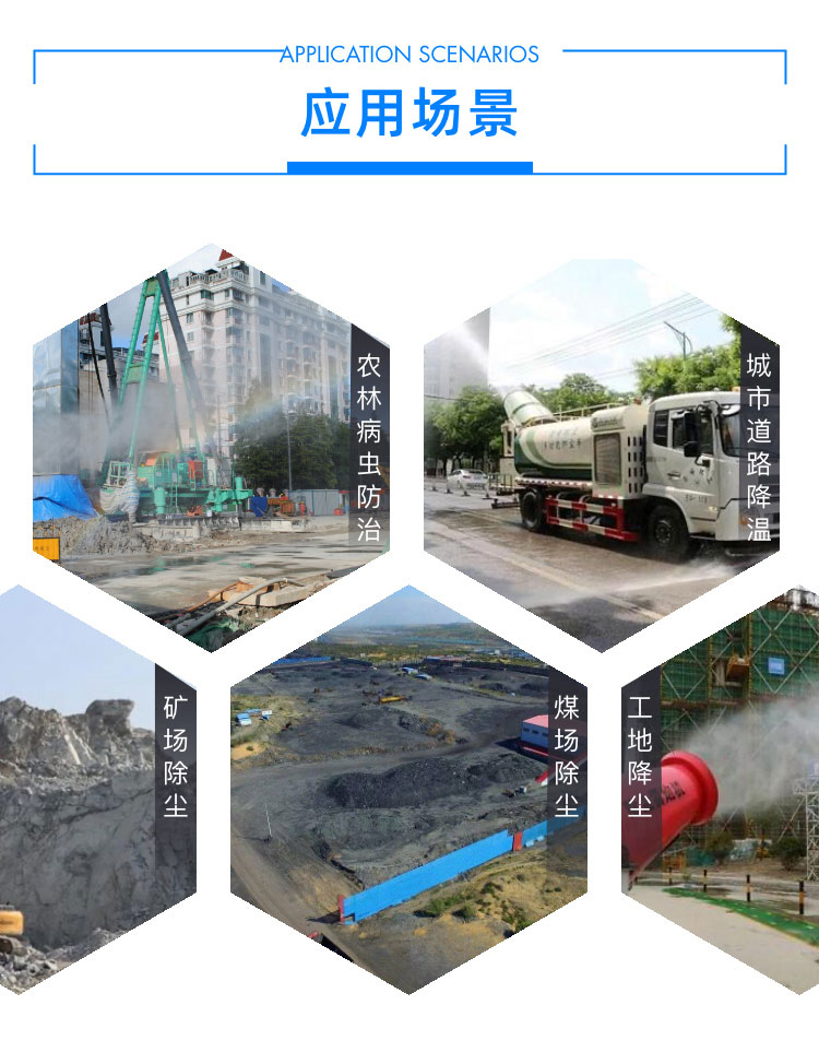 主要用途:用于煤矿场、城市拆迁工地、冶金钢铁企业、采矿区域、煤化工企业、水泥厂、火力发电厂、物料和矿产品露天堆放厂、混凝土处理厂、垃圾堆放场、垃圾焚烧厂、沙厂、干式物料仓库、露天爆破、重度粉尘区域。