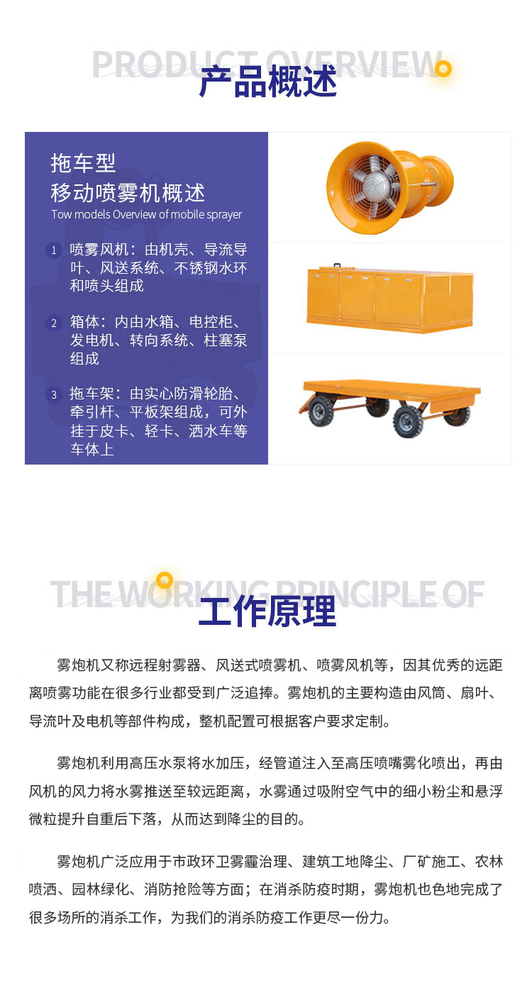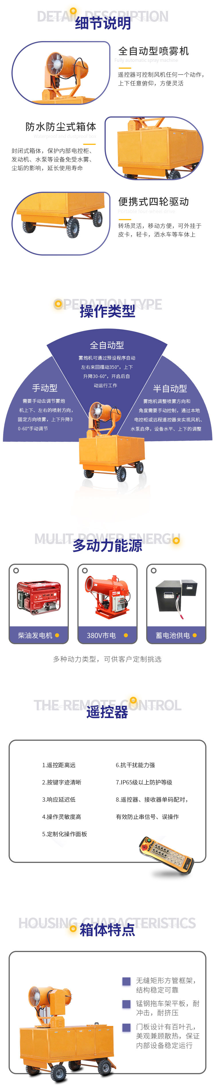 产品特点:农林拖车型雾炮机移动方便,内置水箱,遥控器可控制风机任何一个动作,可外挂于皮卡,轻卡,洒水车等车体上。