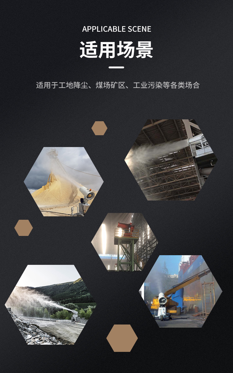 主要用途:用于煤矿场、城市拆迁工地、冶金钢铁企业、采矿区域、煤化工企业、水泥厂、火力发电厂、物料和矿产品露天堆放厂、混凝土处理厂、垃圾堆放场、垃圾焚烧厂、沙厂、干式物料仓库、露天爆破、重度粉尘区域。