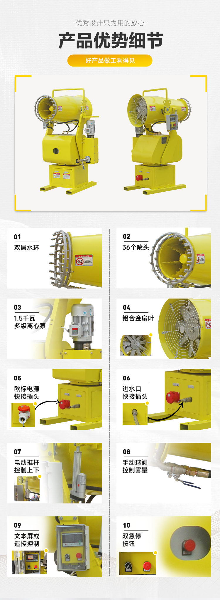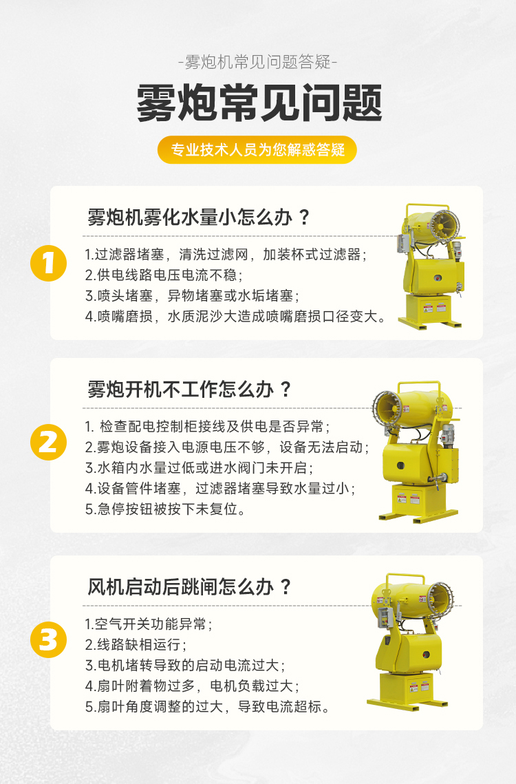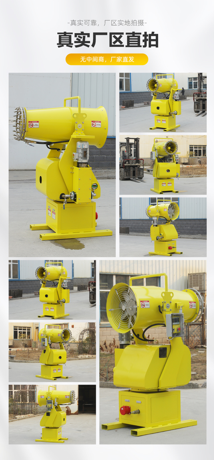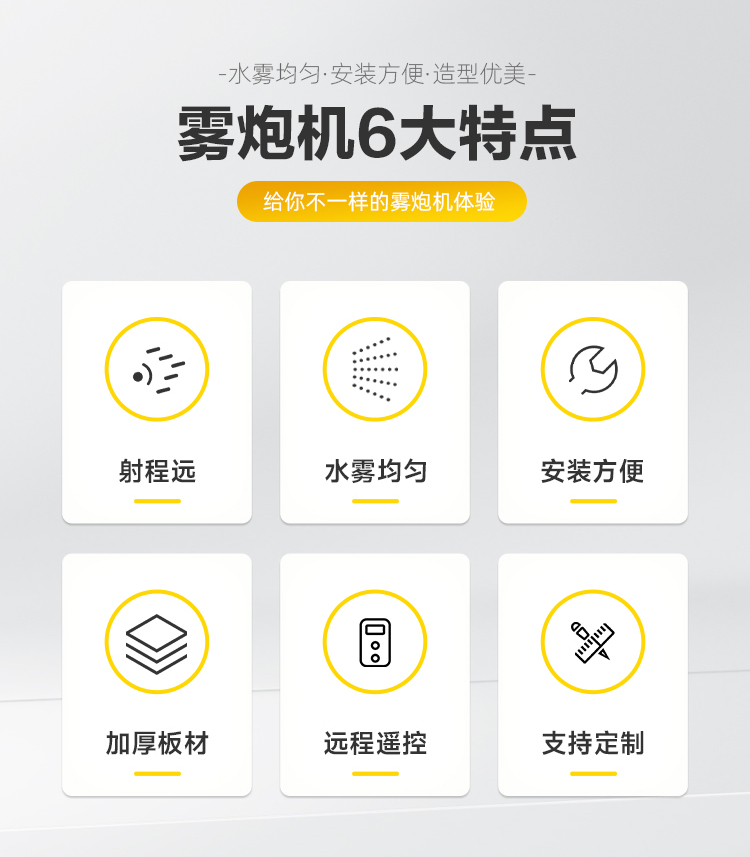 产品特点:分体式雾炮机适用于需要降尘、湿润、环境治理等场合的使用,能够有效改善空气质量,保护环境和人员健康。根据不同场合的实际需求,分体式雾炮机具有灵活性强、操作便捷等优点,可以满足各种环境治理工作需求。