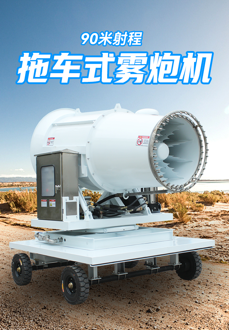 产品特点:90米拖车式雾炮机采用四轮牵引设计,移动性强、动力强、射程远、覆盖广泛、可实现精量喷雾;工作效能高、喷雾加湿更快,能迅速降温抑尘;配件驱动可灵活定制,操作便捷,灵活方便。