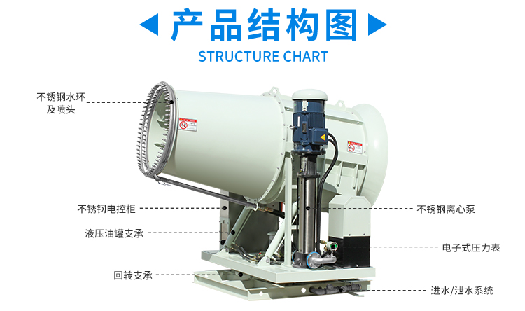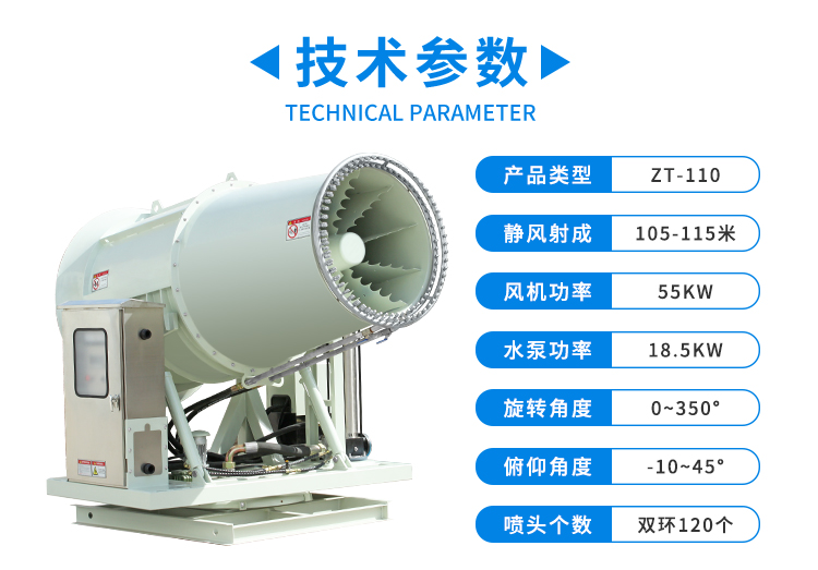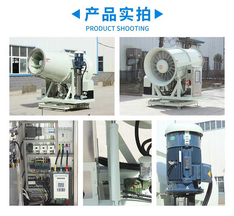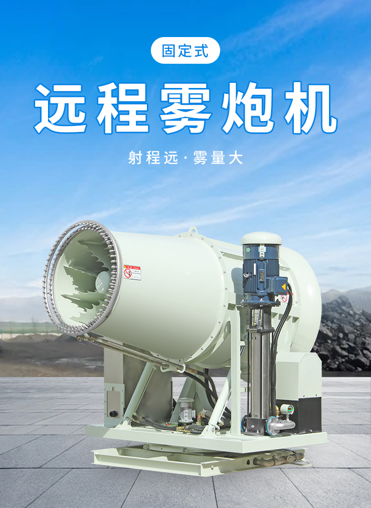 产品特点:固定式远程雾炮机,射程远、雾化大,风量可达到220000-250000m3/h,喷雾范围广,可实现大范围场景的降温除尘。搭配PLC电控箱,可保障电路稳定。
