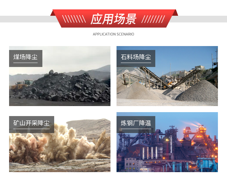 主要用途:煤厂降尘,施工工地降尘,矿山开采降尘,料场降尘,炼钢厂降温等。