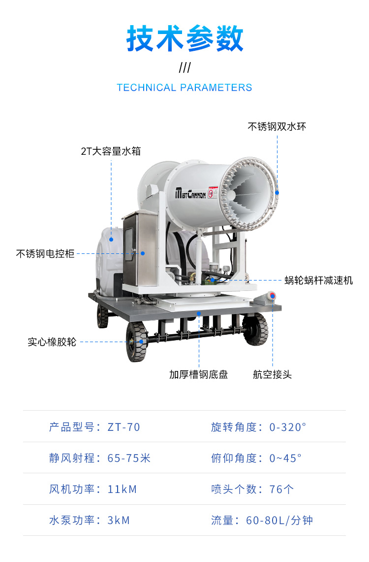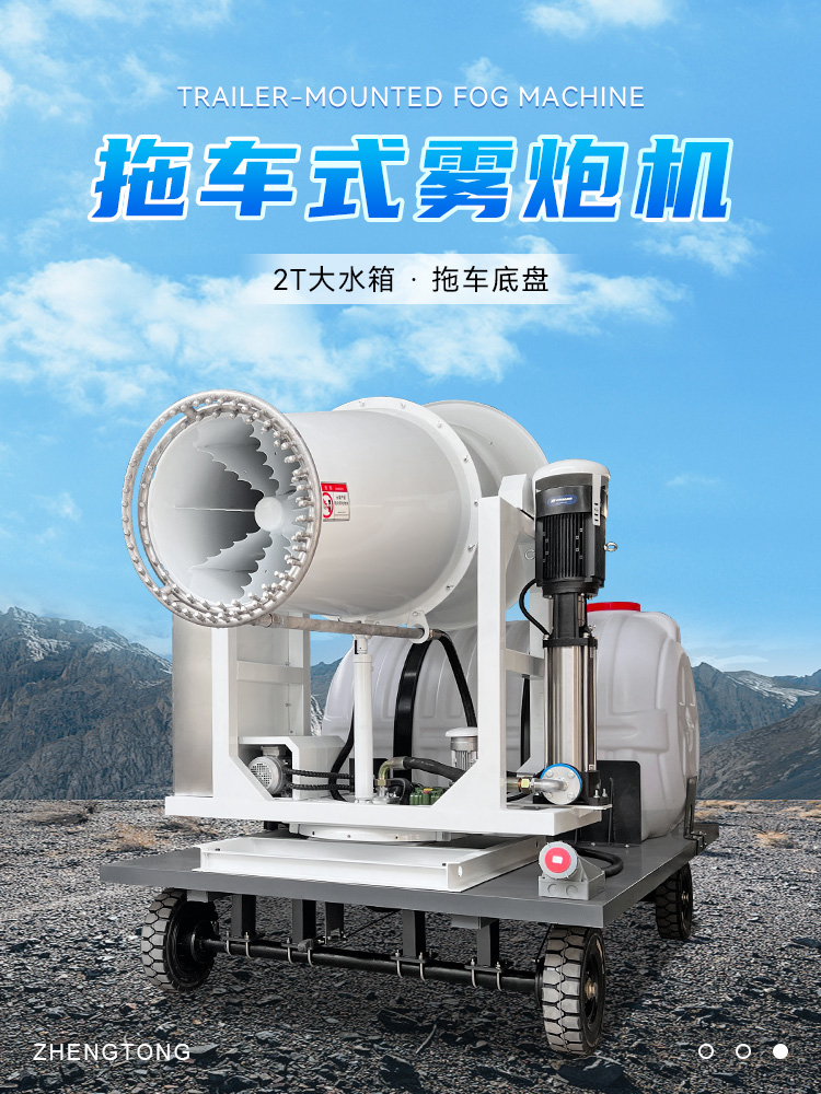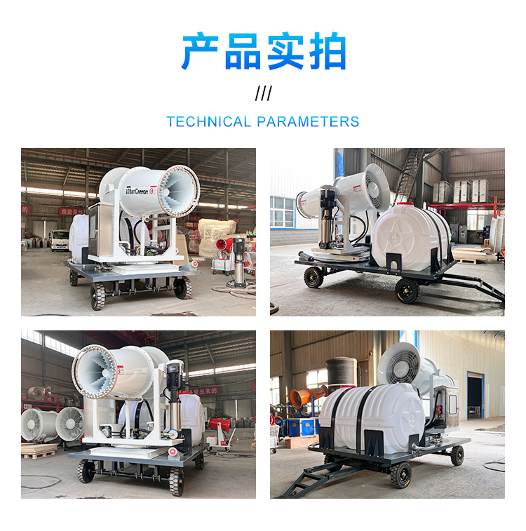 产品特点:70米拖车式雾炮机具有多项特点,其射程远、穿透力强,能覆盖大面积区域,实现快速降尘。配备2T水箱,确保长时间连续作业,无需频繁加水。该雾炮机采用PLC智能控制,具备手动、自动和??厝挚刂颇J?,操作便捷灵活。