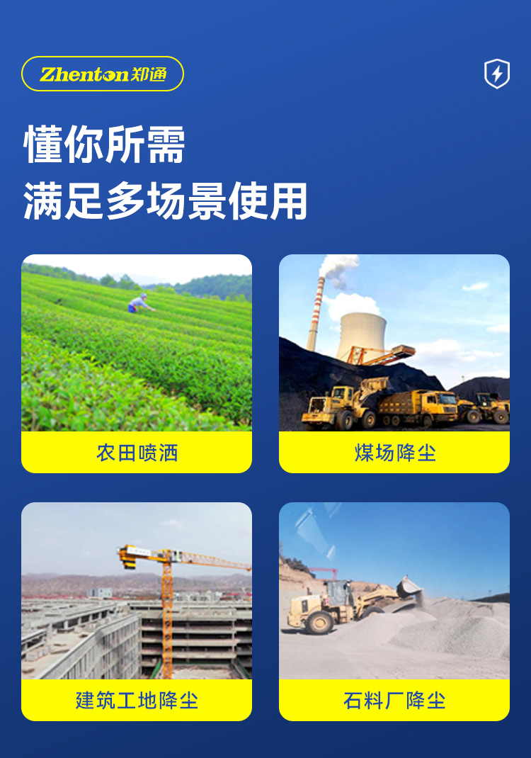 主要用途:广泛适用于石料厂、煤场、矿山、建筑工地、农田喷洒、城市道路降尘。