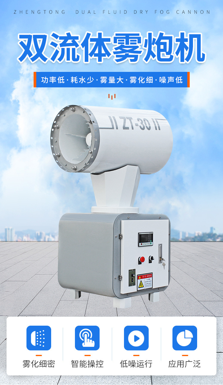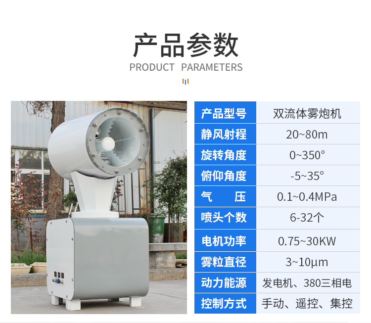 产品特点:双流体干雾炮是一种先进的喷雾设备,通过特殊设计的喷头,将液体和压缩空气混合,形成微米级的细小雾滴,相比传统的湿法喷雾,双流体干雾炮使用的水量更少,且雾滴更细小,能够减少水资源的浪费。配备有电动或气动驱动系统,可以方便地调整喷雾角度、范围和强度。