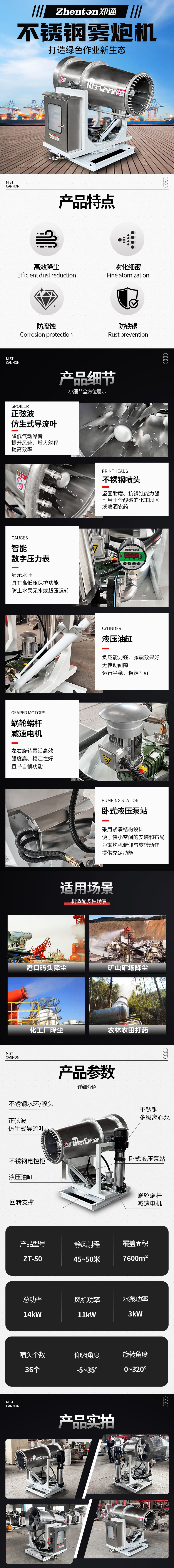 产品特点:不锈钢雾炮机是郑州郑通风机制造有限公司新款升级,50米左右的射程,总功率14KW,喷雾范围可达7200㎡,36个不锈钢喷头,坚固耐用,抗锈蚀能力强。炮筒采用不锈钢材质,雾化细密,防腐蚀防铁锈。风筒设计采用正弦波仿生式导流叶,不仅降气动噪声还提高风速、增大射程,大大提高了除尘效率。有手动,全自动,远程??兀悄芟低车瓤刂品绞?。15-150米射程,型号齐全,支持定制,有需要请联系:17303712073(微信同号)