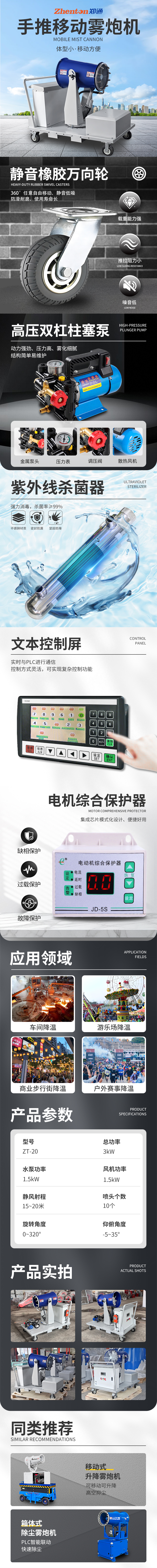 产品特点:ZT-20型手推移动式雾炮机是郑州郑通风机制造有限公司生产制造,体积小,移动式设计,可360°任意自由移动,静音低噪,防滑耐磨。配置高压双杠柱塞泵,动力强劲,压力高,雾化细腻,且结构简单易于维护。由于这台设备可用于冷链物流仓储喷雾消杀,还配置紫外线杀菌器,强力消毒,杀菌率≥99%。操作方式有文本控制屏(即“手动”)、远程??亍⑷远?。
