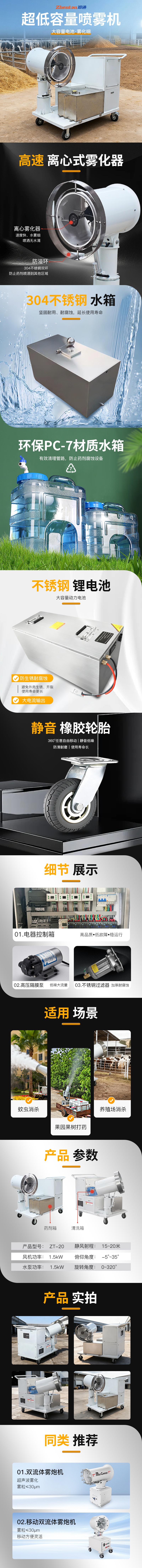 主要用途:蚊虫消杀、果园果树打药、养殖场消杀、物流园消毒、工地降尘、矿区降尘、垃圾场除臭等场景。