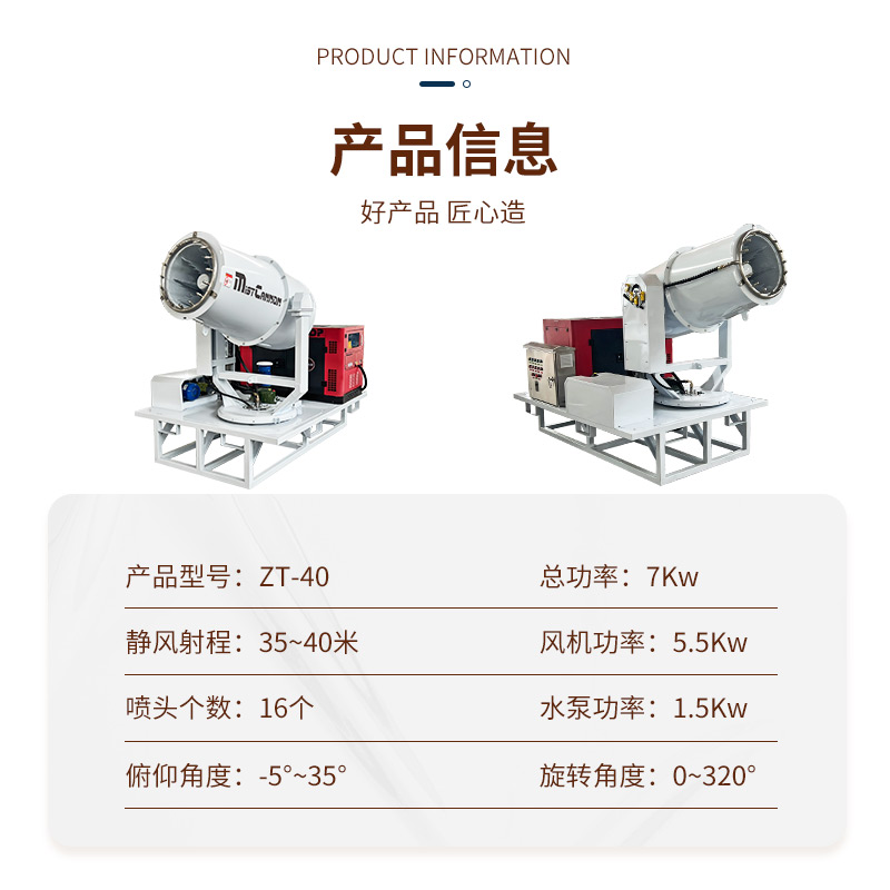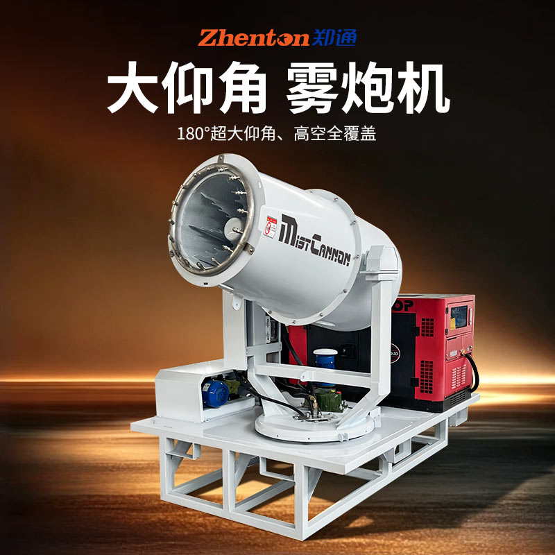 产品特点:这款40型隧道养护大仰角雾炮机,静风射程 35-40 米,总功率 7KW,搭载 180° 超大仰角设计,垂直向上全覆盖喷射,轻松应对隧道、高空、密闭高耸空间作业,降尘无死角。风筒内置微穿孔板消音层,有效降噪 5~8 分贝,远超同行水平,作业低噪不扰民。配备静音发电机组,电流稳定、动力强劲,户外场景也能稳定运行。不锈钢电控柜防水防尘耐腐蚀,搭配蜗轮蜗杆减速机、上下链条控制结构,角度调节灵活高效,拉力足、稳定性强,0~180° 俯仰精准可控。