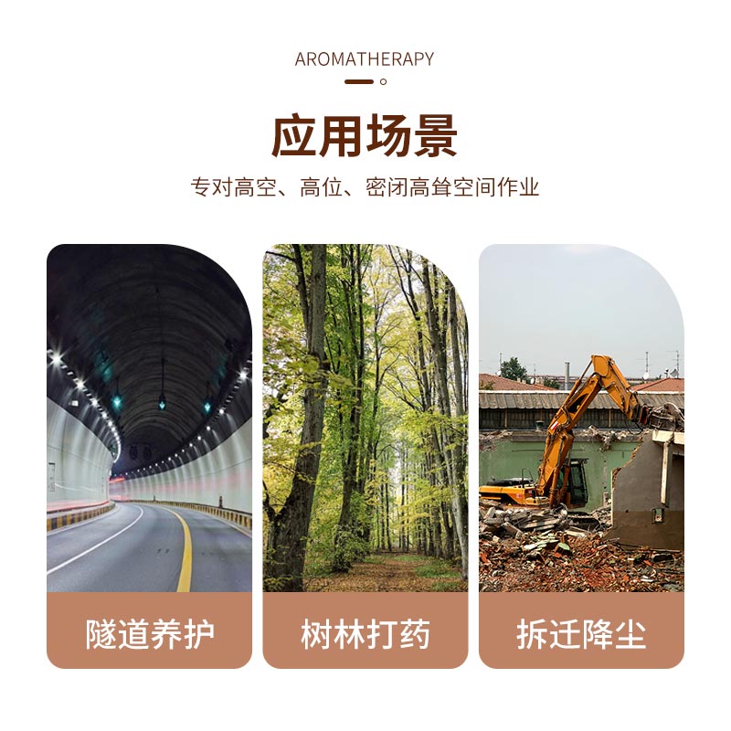 主要用途:隧道养护、树林打药、拆迁降尘、煤棚超低排放、废水蒸发、矿山破碎机降尘等。