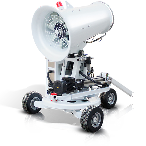 牵引式雾炮机的主要构成部分是由:机壳、进风口、出风口、电控柜、不锈钢多级离心泵、液压推杆、转向系统、加强型槽钢底盘、牵引拖架、实心防滑橡胶轮等。