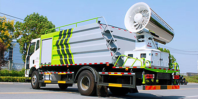 通过高压水泵把水加压通过特定的管道输送到喷头处,再由风筒产生气流将微雾粒子输送出去从而进行喷雾作业。